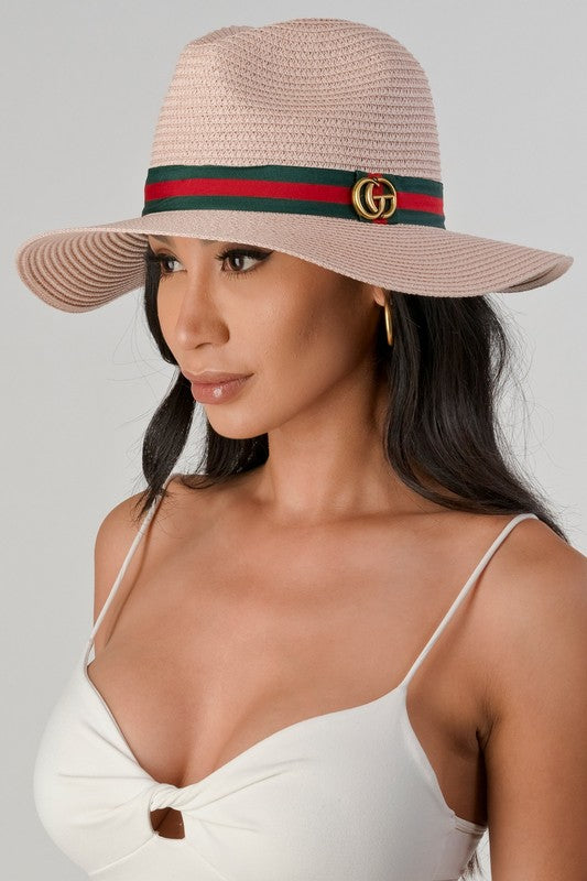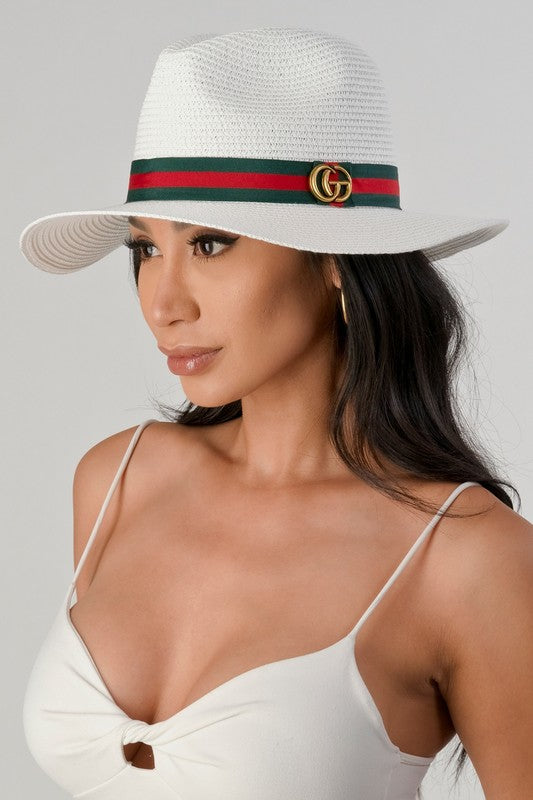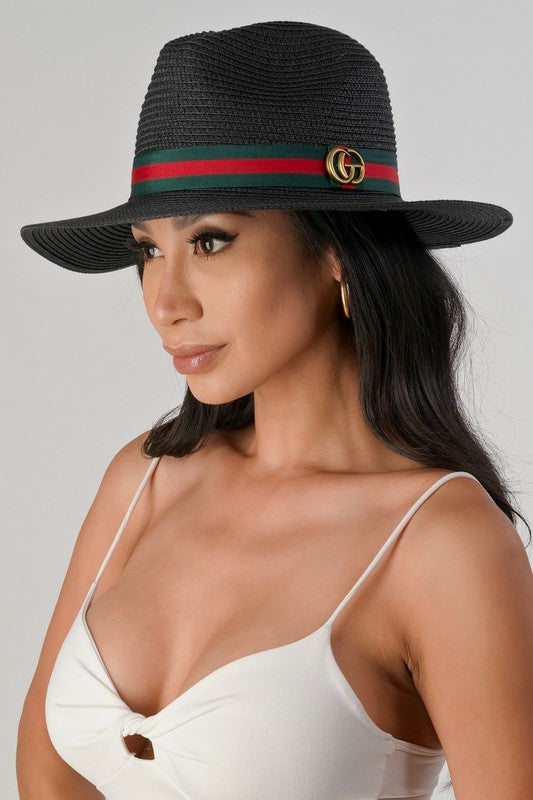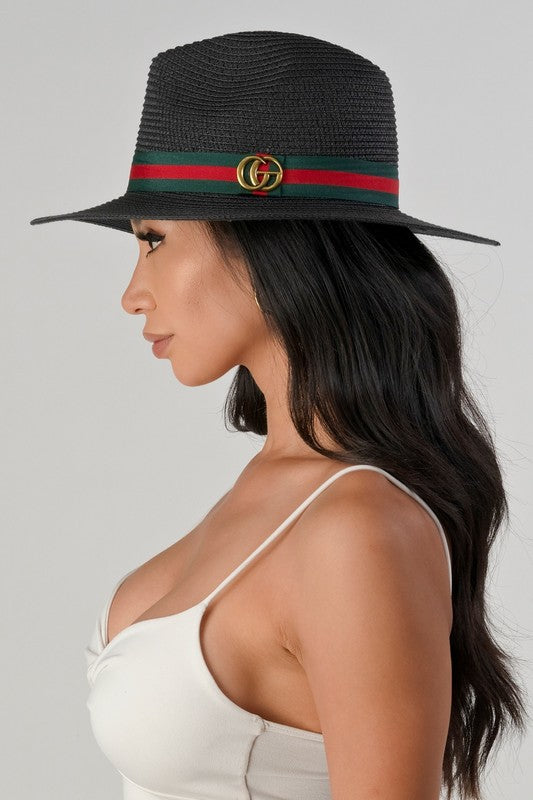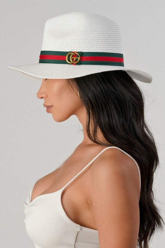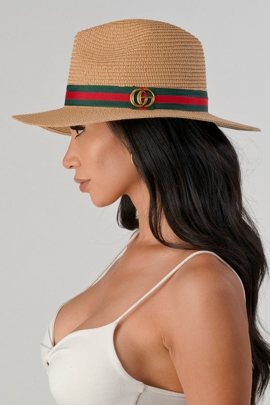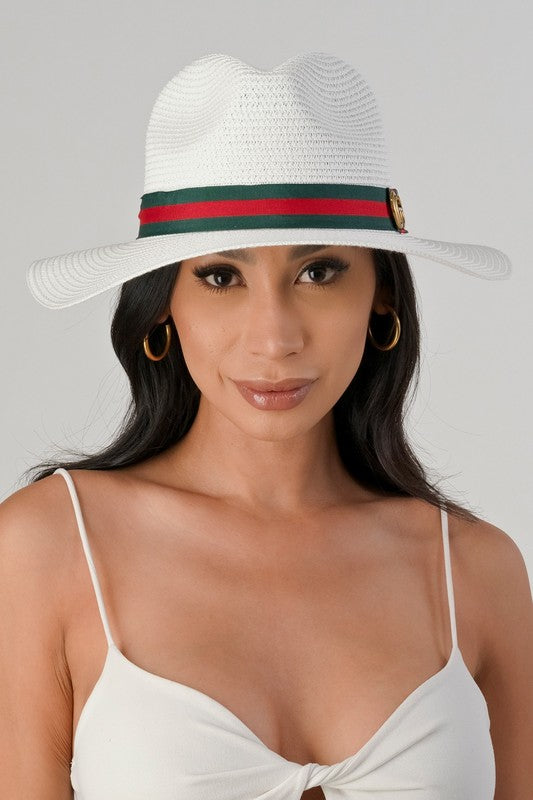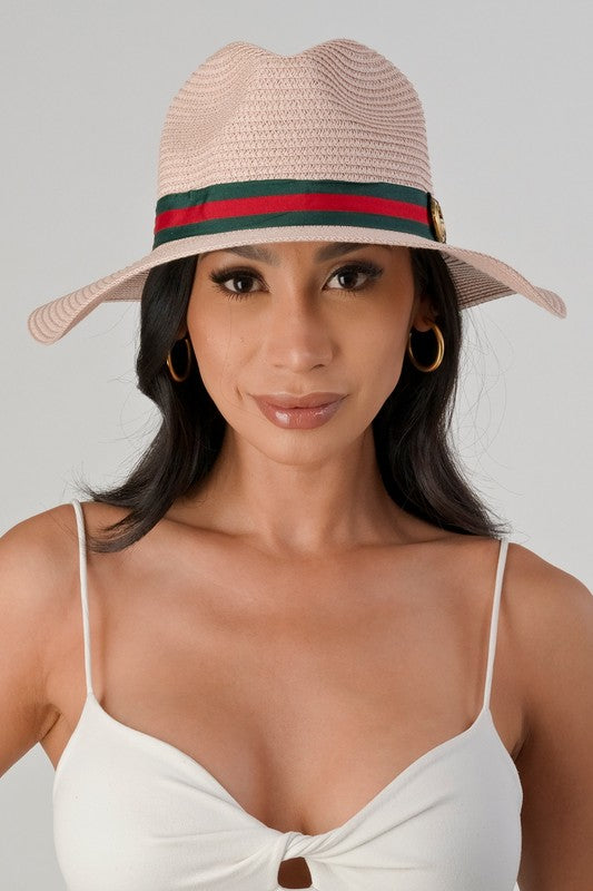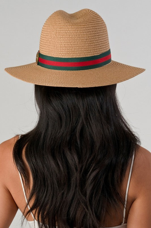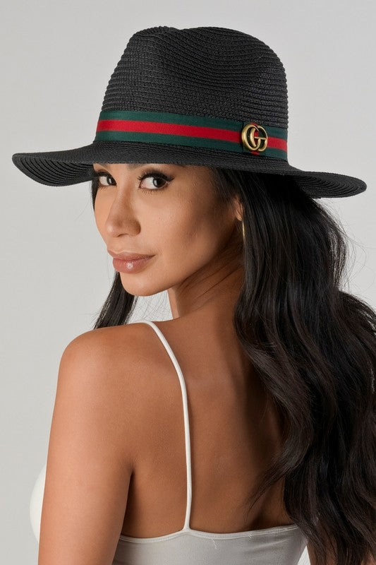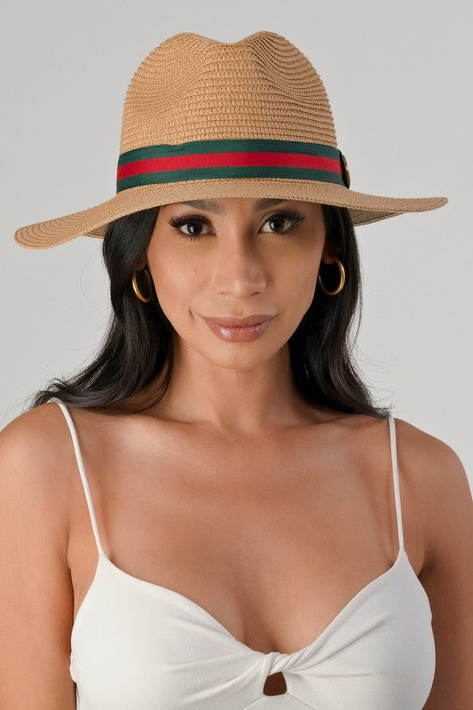 GO Decorated Green and Red Band Straw Fedora Hat 3.25" Brim