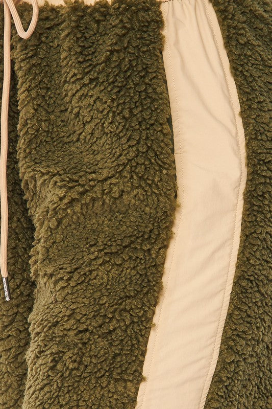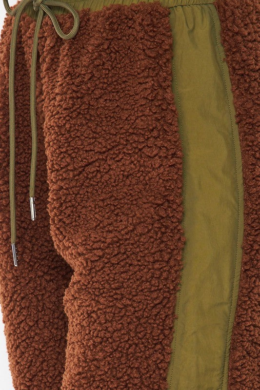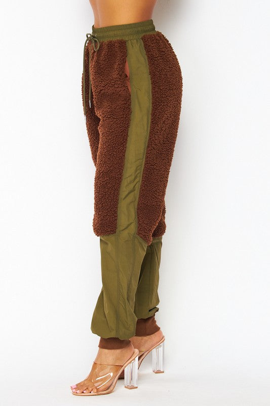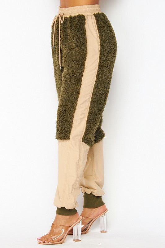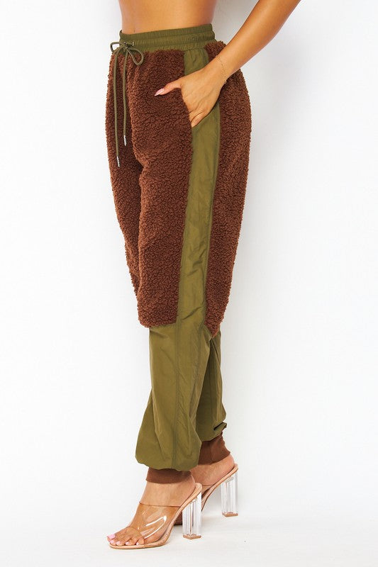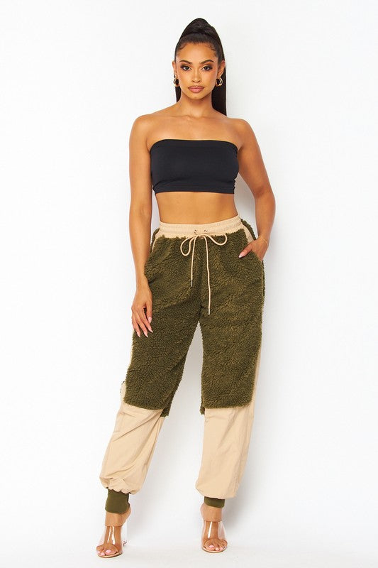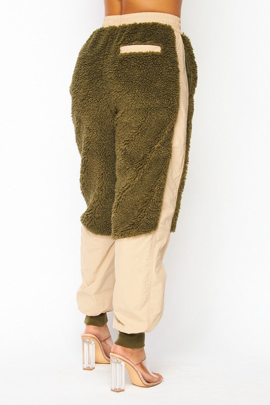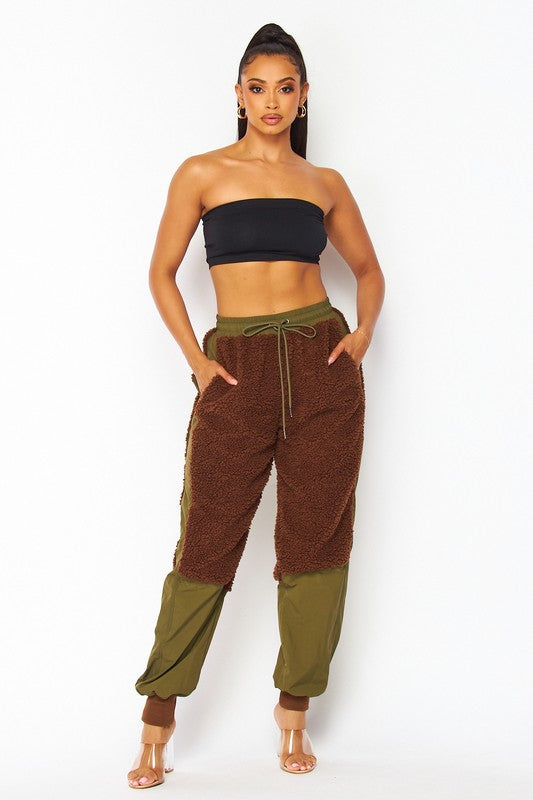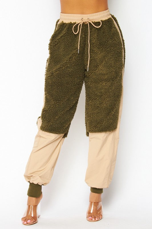Nylon Fleece Contrast Cargo Jogger Pants - Fleece Contrast Detailing - High Rise Waist - Drawstring Waist - Side Pockets - Lined