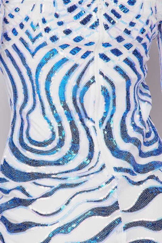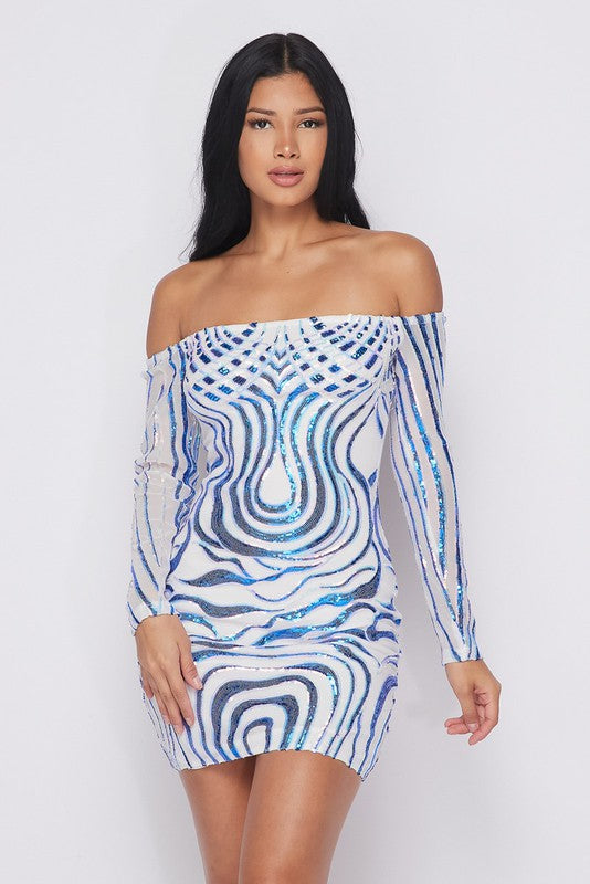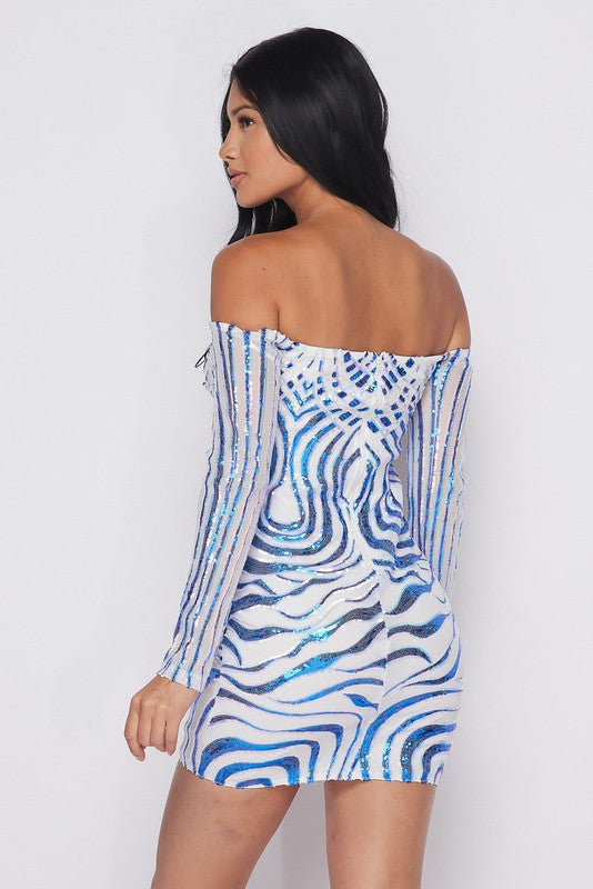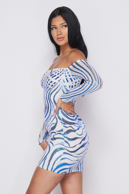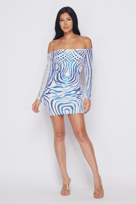 - Long Sleeves Mini Dress - Off Shoulder - SEQUIN DETAIL - ZIPPER CLOSURE AT BACK